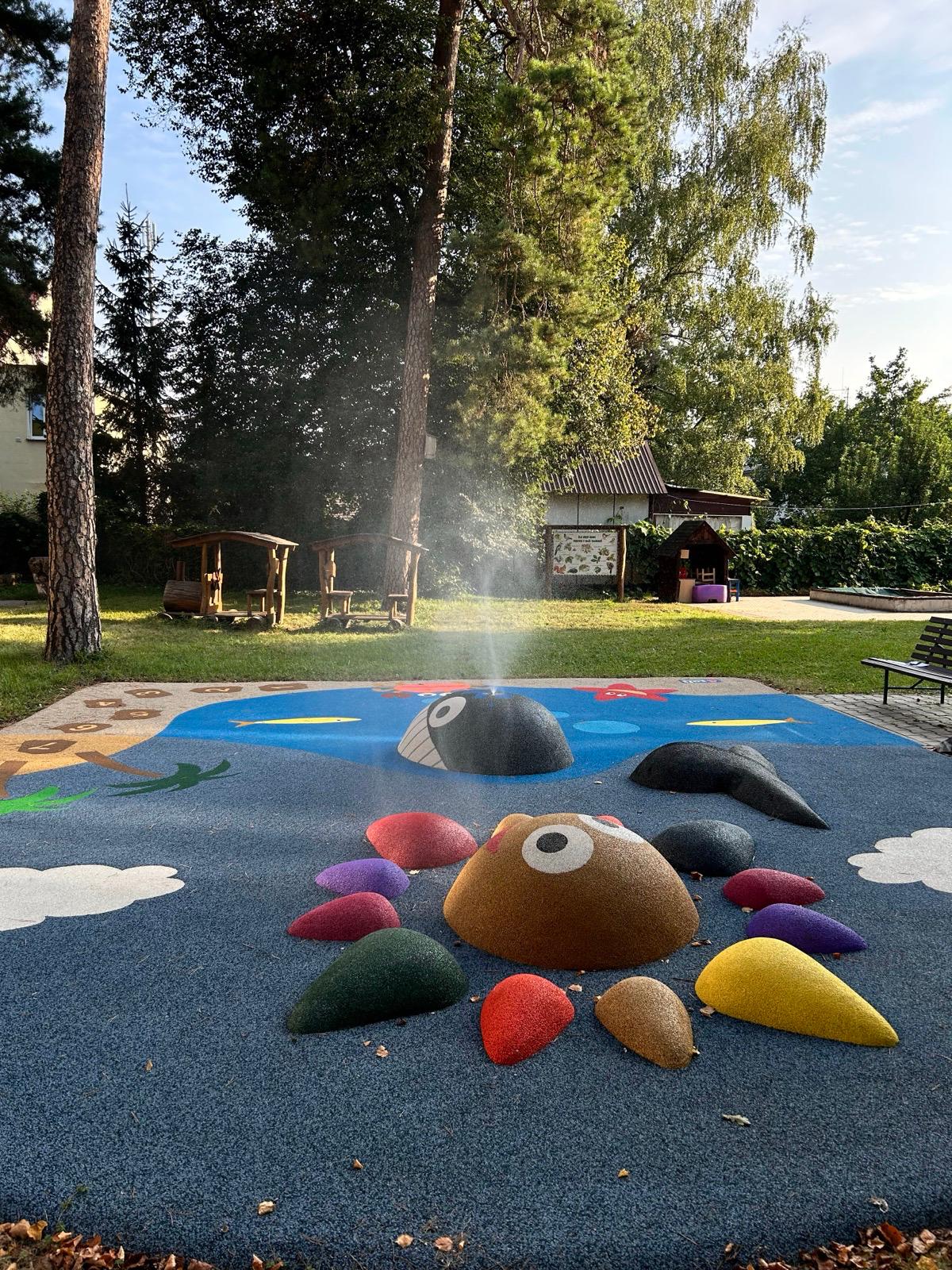 Když vejdete do areálu školky, projdete rozsáhlou zahradou tvořenou z části lesíkem s jehličnatými a listnatými stromy a z části zatravněnou plochou. Po rekonstrukci v roce 2015 přibyly moderní herní prvky a záhonky pro pěstitelské činnosti dětí, ale i zážitkové záhonky. Zahradu školky využíváme k nejrůznějším činnostem, nejen poznávacím, ale také sportovním. Lesní prostředí poskytuje dostatek možností ke zkoumání, pozorování živočichů, k práci s přírodninami a také k vytváření kladného vztahu k přírodě.